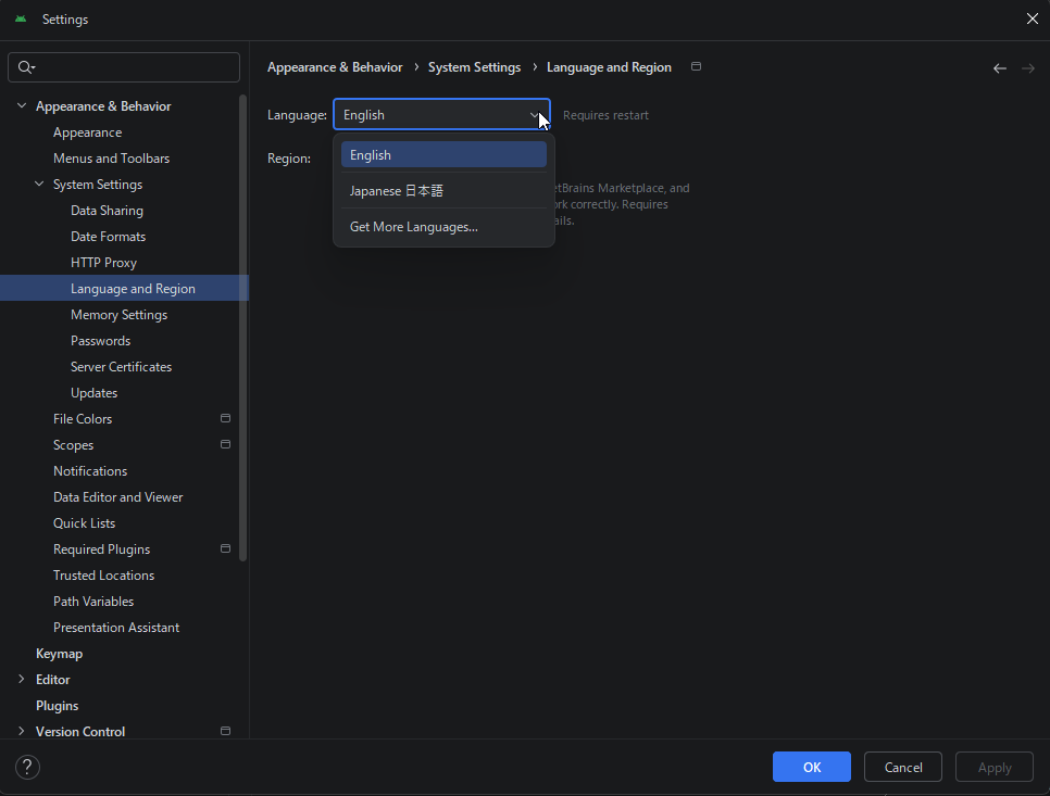 プラグインの「Japanese Language Pack」を有効にしていないと「Language and Region」に日本語が出てこない。