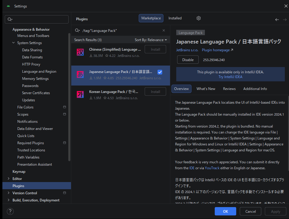Jetbrainsで日本語プラグインが入っているzipをダウンロードする。