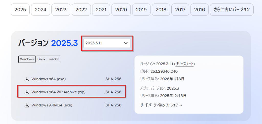 Jetbrainsで「2025.3.1.1」を探してZIP archiveをダウンロードする。(Patch1なので3.1.1)