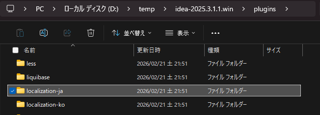 「idea-2025.3.1.1.win」→「plugins」の「localization-ja」をコピーする。